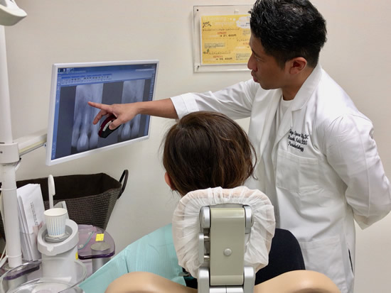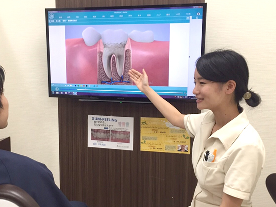 その後、メドバイザーというアニメーションソフトを使用して、治療の必要性、治療の流れなど大まかに説明した後、ご本人のお口の話に戻って具体的に説明していきます。